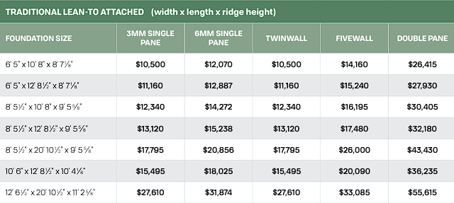 Glazing type heavily affects price. Double-pane glass is always the biggest jump. Anytime you can justify polycarbonate on the roof, do this, and spend on glass where it counts.